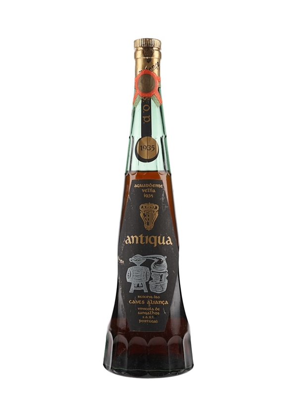 A bottle of Antiqua 1935 VSOP Aguardente Velha, Reserva das Caves Alianca, bottled by Vinicola de Sangalhos, Portugal.