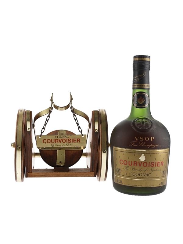 A bottle of Courvoisier VSOP Fine Champagne Cognac, 'The Brandy of Napoleon' presented in a wooden cannon cradle. We estimate this was bottled in the 1990s.