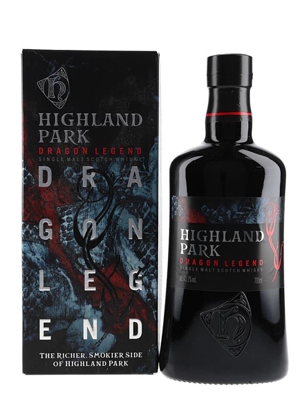 A bottle of Highland Park Dragon Legend Single Malt Scotch Whisky, a richer and smokier expression than the distillery's 10 and 12 year old. This is made from a higher percentage of peated malt stock and matured in European and American sherry-seasoned oak casks.