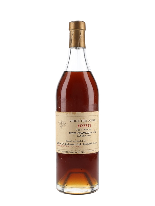 A bottle of Denis-Mounie 1934 Vielle Fine Petite Champagne Cognac produced in France. This was landed in the England in 1935, and was shipped and bottled by Ellis & Co. (Richmond) Ltd., Richmond, Surrey. We estimate this was bottled in the 1950s.
