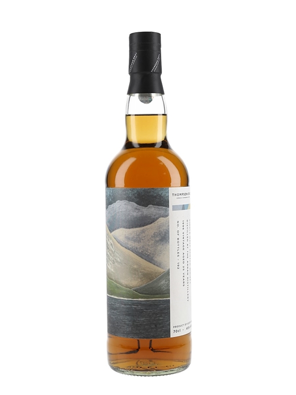 A bottle of Arran 25 Year Old Single Malt Scotch Whisky. This was distilled in 1996, selected by Thompson Bros and bottled at 49% ABV.