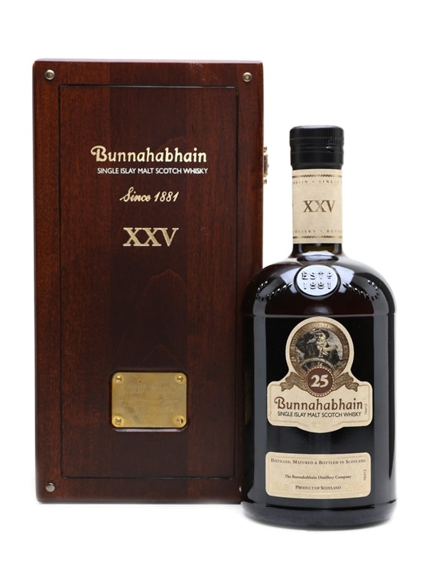 A bottle of Bunnahabhain 25 Year Old, bottled at 43% ABV and presented in a wooden case.