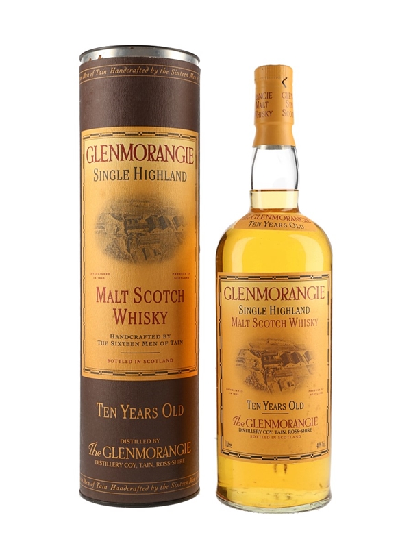 A litre bottle of Glenmorangie 10 Year Old Single Highland Malt Scotch Whisky. The bottling code indicates this was bottled in 2009.