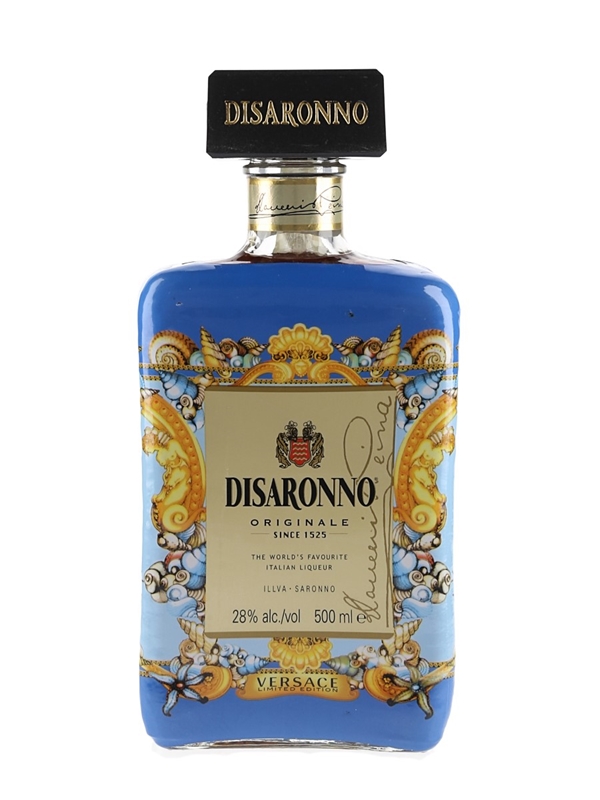 A limited edition 50cl bottle of Disaronno Amaretto Originale Liqueur, with packaging designed by Italian fashion house Versace.