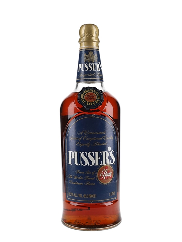 A litre bottle of Pusser's Imported Rum, a blend of six rums produced in Guyana, Trinidad and British Virgin Islands. This was bottled by Munson Shaw Co., we estimate in the 1990s.