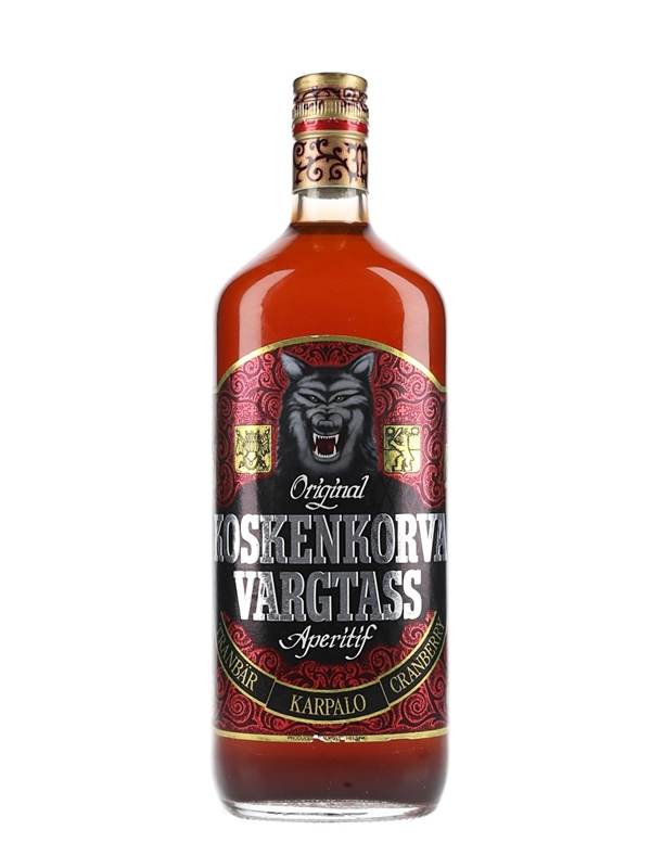 A 100cl bottle of Koskenkorva Vargtass cranberry aperitif from Helsinki, Finland.