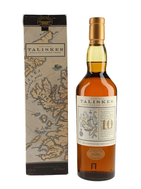A bottle of Talisker 10 Year Old Single Malt Scotch Whisky, with the label featuring a map of the Isle of Skye. We estimate this was bottled in the 1990s.