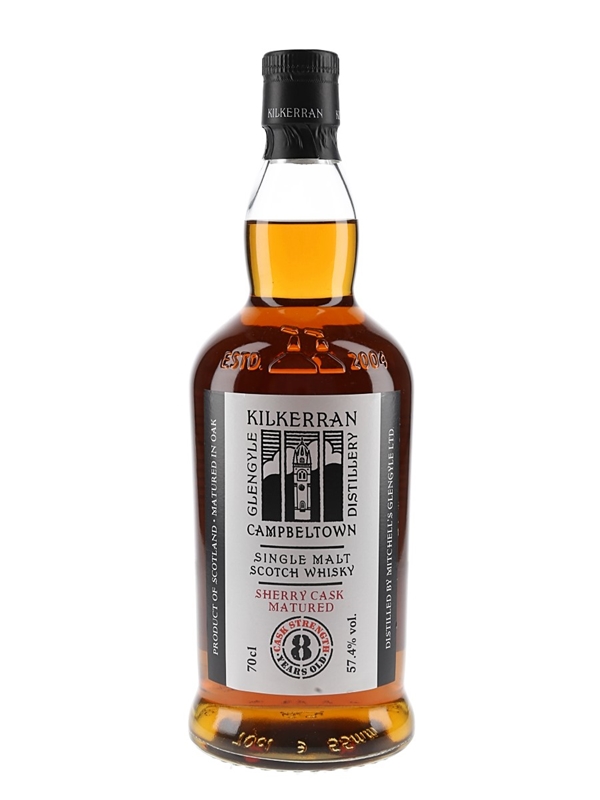 A bottle of Kilkerran 8 Year Old Cask Strength Sherry Cask Matured Campbeltown Single Malt Scotch Whisky, distilled by Mitchell's Glengyle Ltd. and bottled at 57.4% ABV. The bottling code indicates this was bottled on 8 January 2024.