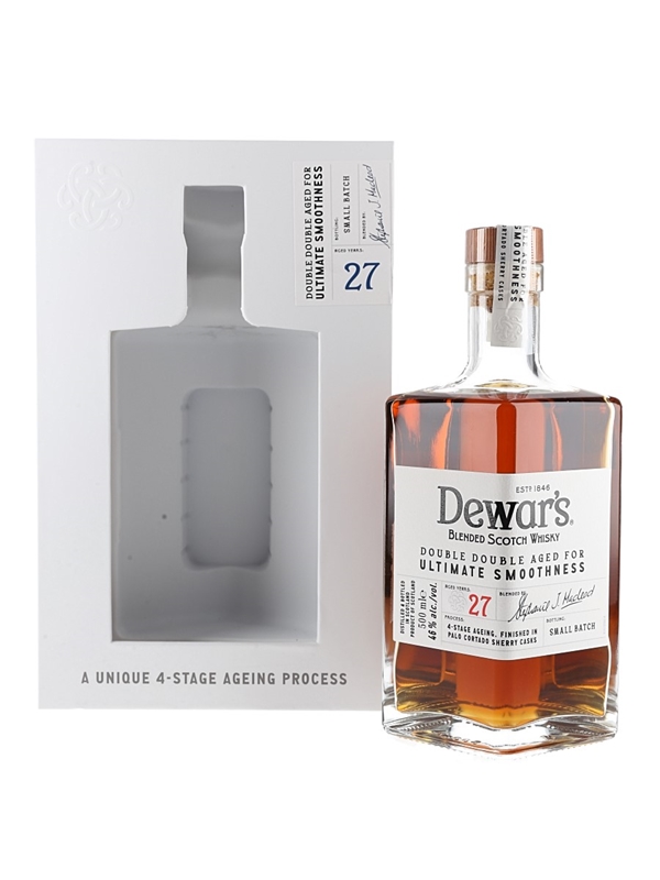 A 50cl bottle of Dewar's 27 Year Old Blended Scotch Whisky, finished in Palo Cortado sherry casks and bottled as part of Double Double series.