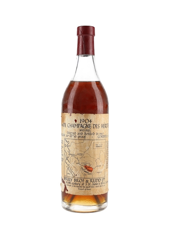 A 68cl bottle of Berry Brothers & Rudd Grande Champagne Des Heritiers 1904. This has been shipped and bottled in 1967 at 30 under proof, or 40% ABV.
