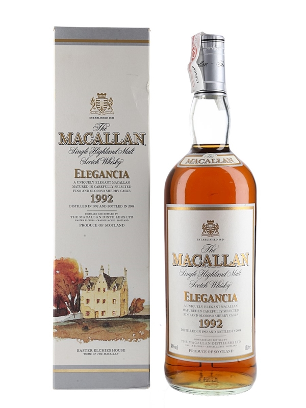 A litre bottle of The Macallan 1992 Elegancia Single Highland Malt Scotch Whisky. This expression was distilled in 1992, matured in fino and oloroso sherry casks and bottled in 2004.