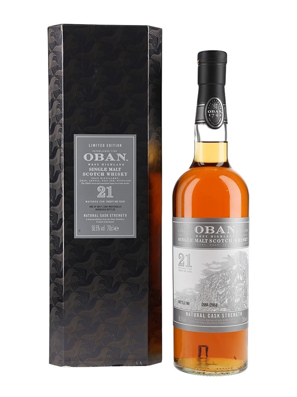 A limited edition bottle of Oban 21 Year Old Single Malt Scotch Whisky. This is bottled at cask strength of 58.5% in 2013.