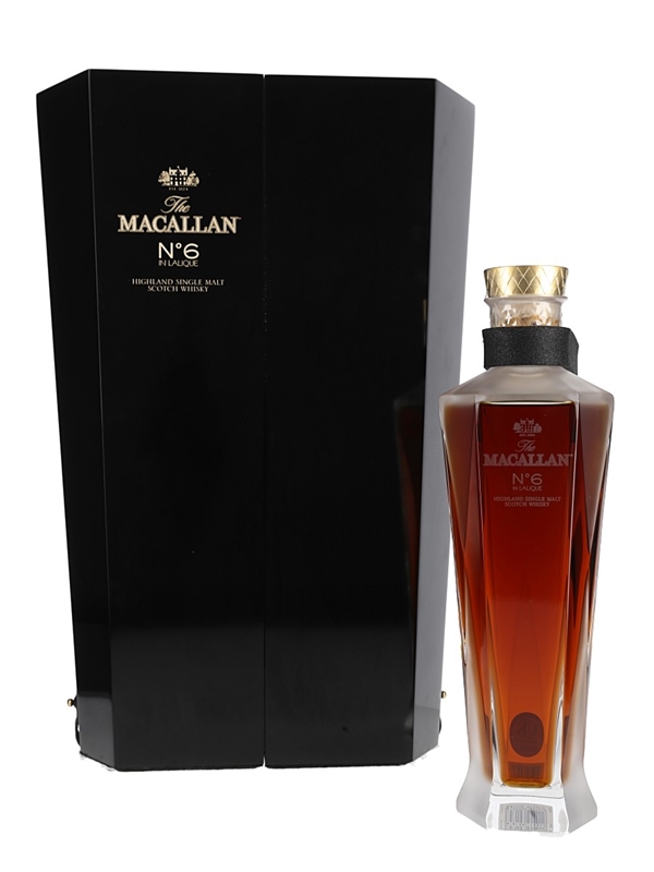 A bottle of The Macallan No. 6 in Lalique Decanter Single Malt Scotch Whisky. This was matured for an undisclosed length of time in first fill Jerez de la Frontera Sherry Casks and is presented in a Lalique crystal decanter designed by French Company Lalique, housed in a mirrored presentation case and bottled as part of the 1824 Master Series.