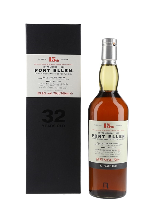 A bottle of Port Ellen 32 Year Old Single Malt Scotch Whisky. This was distilled in 1983 and bottled at a cask strength of 53.9% ABV in 2015. This is the fifteenth release of Port Ellen from Diageo's Special Releases series.