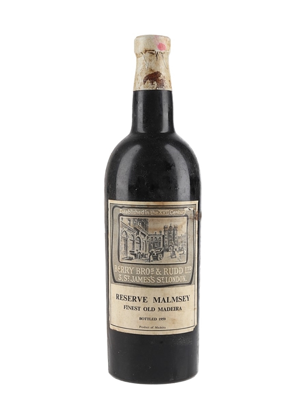 A bottle of Reserve Malmsey Finest Old Madeira bottled by Berry Bro's & Rudd in 1959.