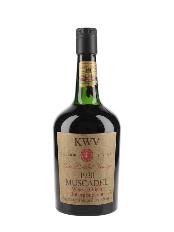 A bottle of KWV 1930 Muscadel Late Bottled Vintage fortified wine from Boberg in South Africa's Western Cape. This was matured in wood for eight years prior to bottling in the late 1930s.