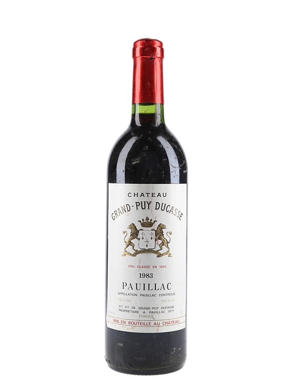 A bottle of 1983 Château Grand Puy Ducasse , a 40 hectare 'Cinquième Cru Classé property in Bordeaux's Pauillac appellation planted with 60% Cabernet Sauvignon and 40% Merlot.