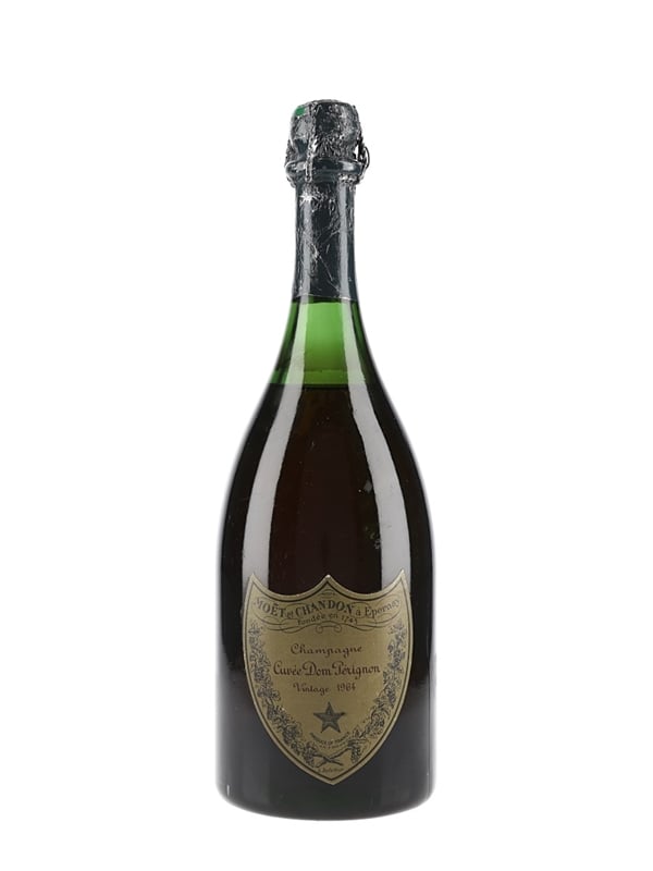A bottle of Dom Pérignon 1964 vintage Champagne from Moët & Chandon, a 50% Pinot Noir and 50% Chardonnay blend.