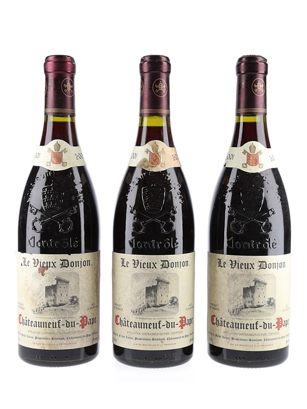 This lot contains three bottles of 2001 Châteauneuf du Pape produced by Le Vieux Donjon in the Southern Rhône's most celebrated appellation. This is a blend of a blend of 75% Grenache, 10% Syrah, 10% Mourvèdre and 5% Cinsault, aged for 18 months in old foudres.