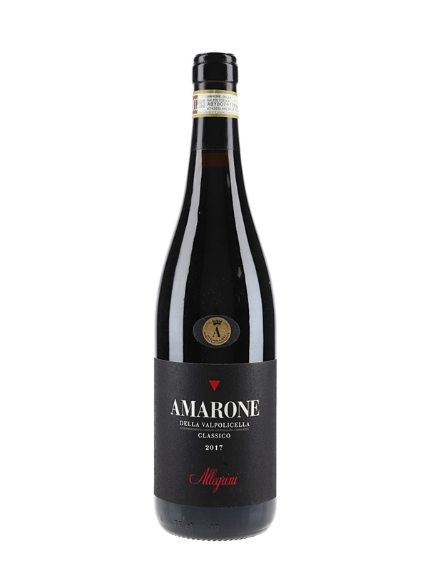 A bottle of 2017 Amarone della Valpolicella Classico from Allegrini, a full-bodied dry red wine made from partially dried fruit. This is a blend of Corvina Veronese, Corvinone, Rondinella and Oseleta.