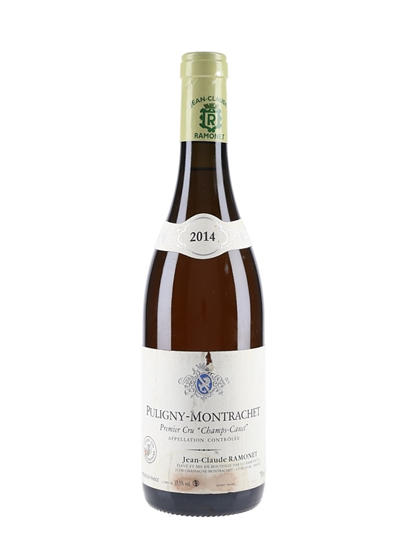 A bottle of 2014 Puligny-Montrachet Champs Canet from Jean-Claude Ramonet, harvested from a 0.33 ha parcel. The vineyard's name comes from a historic owner, Monsieur Canet.