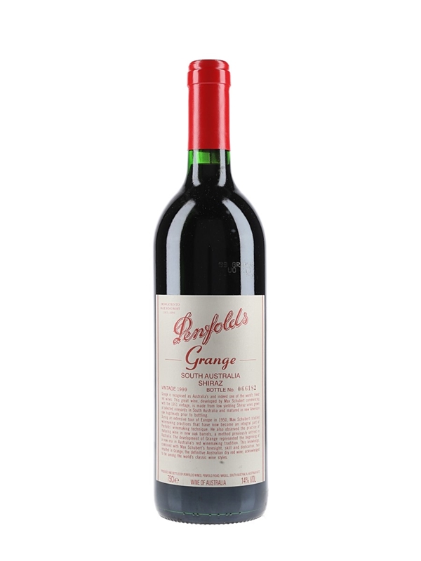 A bottle of Penfolds 1999 Grange from South Australia, matured for 18 months in American oak hogsheads.