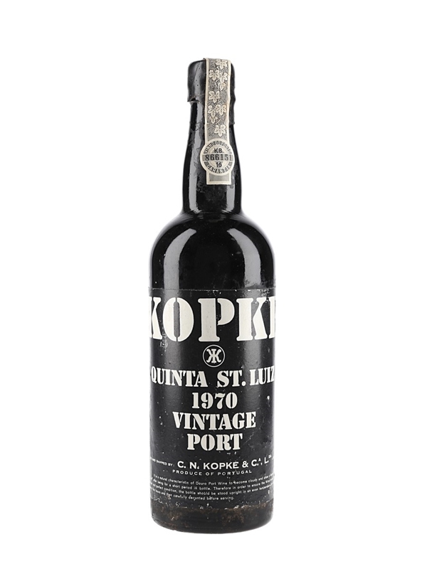 A bottle of Kopke 1970 Quinta St.Luiz Vintage Port harvested from the Quinta de São Luiz, which was acquired by the Kopke family in 1922; it was bottled and shipped by C N Kopke in Vila Nova De Gaia, Porto, Portugal.