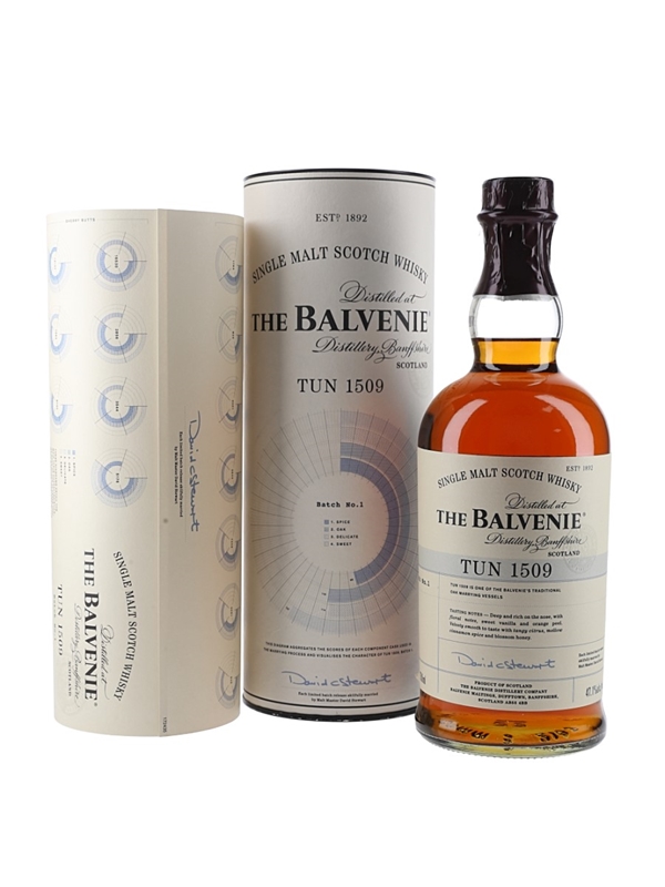 A bottle of the first batch of The Balvenie Tun 1509 Single Malt Scotch Whisky. This is a vatting of malts matured in traditional whisky casks and sherry butts, and all married together in Tun 1509 by Malt Master David Stewart. This includes a chart describing the flavour profiles of the different cask types.