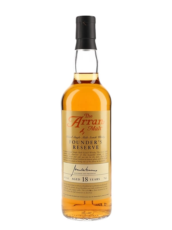A bottle of Arran 18 Year Old Founder's Reserve, bottled specially for those who invested in the distillery since its opening in 1995.