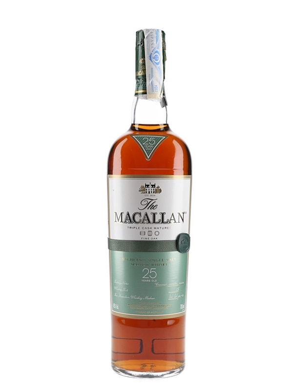 A bottle of The Macallan 25 Year Old Highland Single Malt Scotch Whisky Triple Cask Matured. This was triple matured in a combination of European oak casks seasoned with sherry, American oak casks seasoned with sherry and American oak casks seasoned with bourbon.