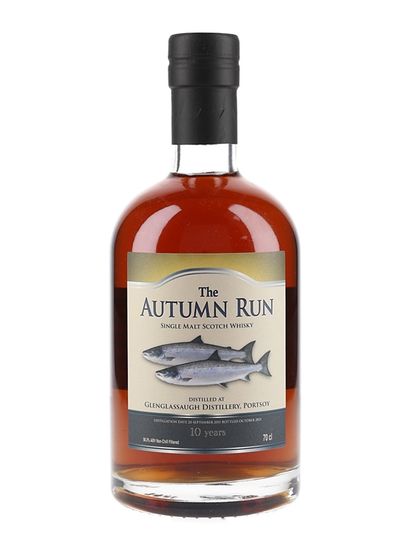 A bottle of Glenglassaugh 10 Year Old The Autumn Run Single Malt Scotch Whisky. This was distilled in September 2011, matured in a first fill oloroso sherry butt and bottled at cask strength in October 2021.