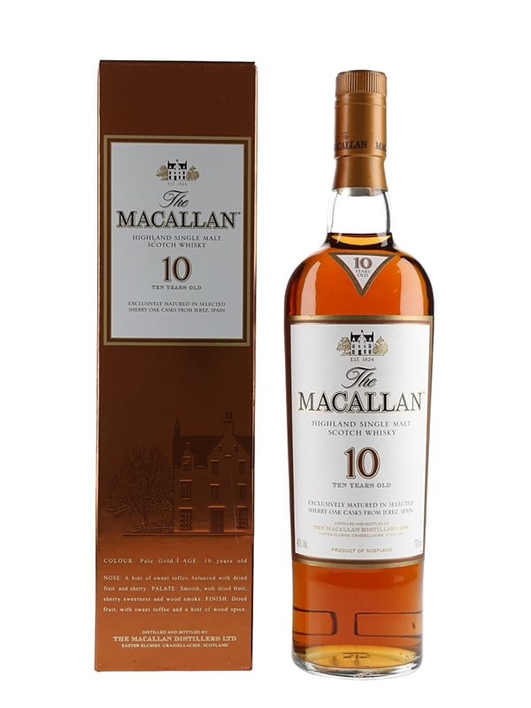 A bottle of The Macallan 10 Year Old Highland Single Malt Scotch Whisky, exclusively matured in selected sherry casks from Jerez, Spain.