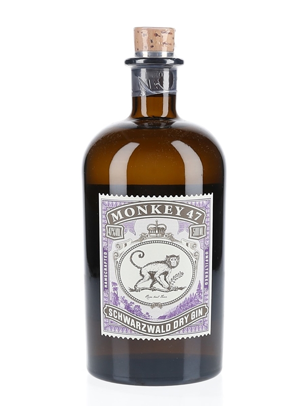 A 50cl bottle of Monkey 47 Dry Gin from Germany's Black Forest. A total of 47 regional botanicals, including Brassica Juncea (brown mustard), are used in the production of this unfiltered gin, bottled at 47% ABV in April 2023.
