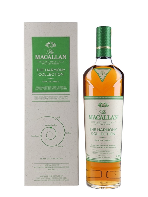 A bottle of The Macallan Smooth Arabica Highland Single Malt Scotch Whisky from The Harmony Collection. This is inspired by the Ethiopian Arabica bean, in collaboration with inspiring masters from around the world of coffee.