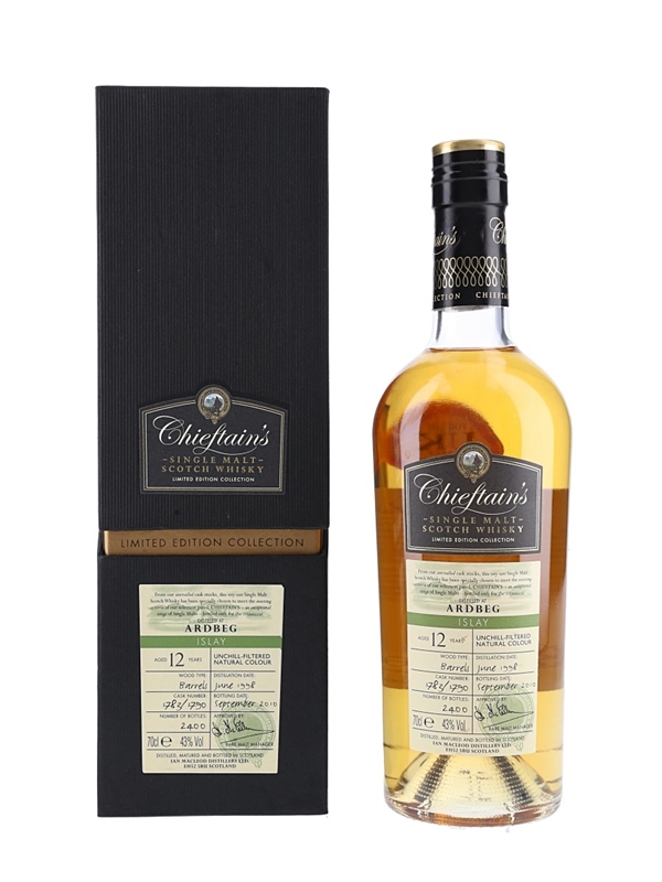 A bottle of Ardbeg 12 Year Old Single Malt Scotch Whisky. This was distilled in June 1998 and bottled in September 2010 by Ian Macleod for the Chieftain's Limited Edition Collection.