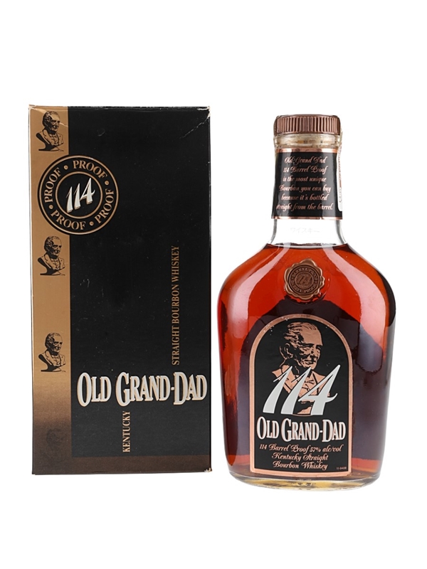 A bottle of Old Grand-Dad 114 Barrel Proof Kentucky straight bourbon whiskey. This was distilled and bottled under US Government supervision by The Old Grand Dad Distillery Co.