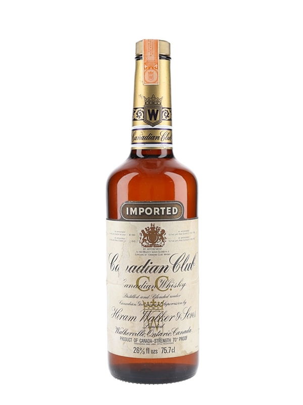 A bottle of Canadian Club whisky, produced by Hiram Walker & Sons. We estimate this was bottled in the 1970s.