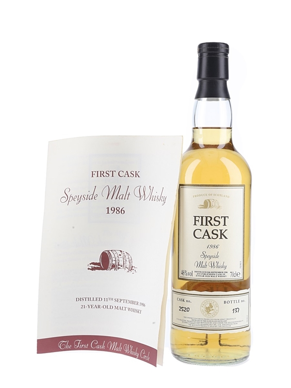 A bottle of Glen Elgin 21 Year Old, distilled on 11 September 1986 and bottled from a single cask. This was bottled by Direct Wines Limited for their First Cask series and was available exclusively to First Cask Circle Members.
