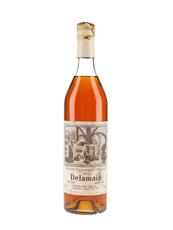 A bottle of Delamain 1976 Grande Champagne Cognac. This was landed in the UK in 1979 and bottled by brewer Eldridge Pope & Co Ltd., Dorset in 1995.