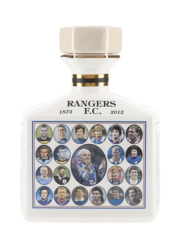 A ceramic decanter from the Pointers of London & Edinburgh. This bottle depicts and describes the history of Rangers Football Club from 1873 to 2012 when the club went bankrupt.