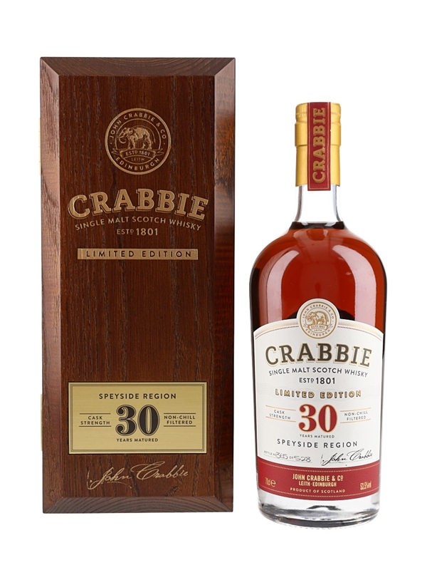 A bottle of 30 Year Old Crabbie Speyside Single Malt Scotch Whisky. This was Bottled in 2019 by John Crabbie at 53.5%.