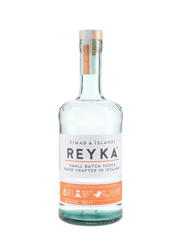 A bottle of Reyka, a small batch vodka hand crafted in Iceland, traditionally distilled and filtered through ancient Arctic lava rocks.