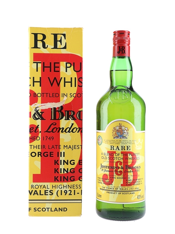 A litre bottle of J&B Rare blended Scotch Whisky. We estimate this was bottled in the 1990s.