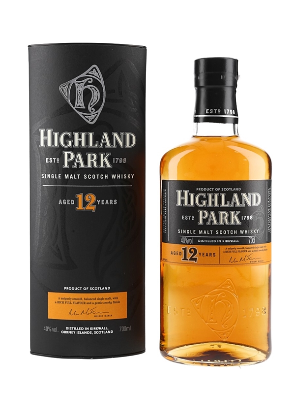 A bottle of Highland Park 12 Year Old Single Malt Scotch Whisky.
