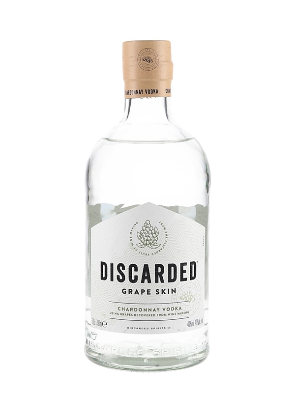 A bottle of Discarded Grape Skin Chardonnay Vodka. This was produced in Scotland by William Grant & Sons Limited.
