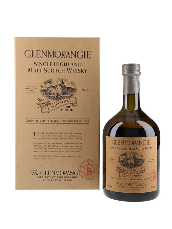 A litre bottle of Glenmorangie Traditional 100° Proof Single Highland Malt Scotch Whisky. This was matured for 10 years before bottling at 57.2% ABV.