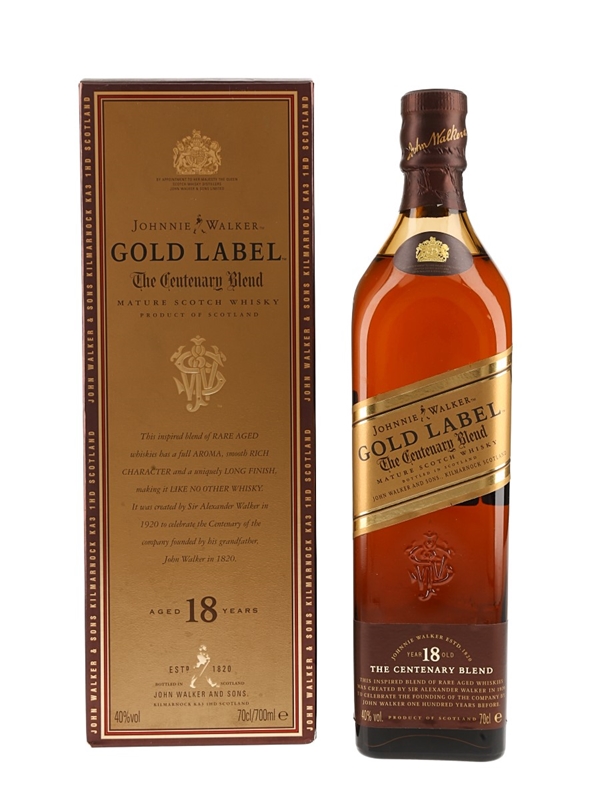 A bottle of Johnnie Walker Gold Label 18 Year Old The Centenary Blend Blended Scotch Whisky, released before the brand dropped the age statement.