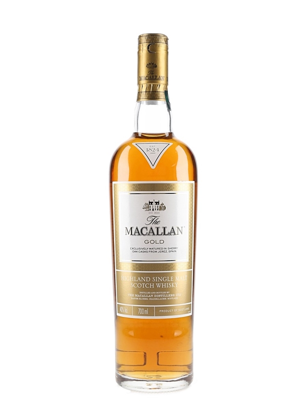 A bottle of The Macallan Gold Highland Single Malt Scotch Whisky, exclusively matured in sherry oak casks from Jerez, Spain, and bottled as part of The 1824 Series.