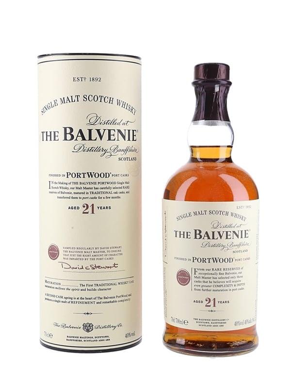 A bottle of Balvenie 21 Year Old PortWood Single Malt Scotch Whisky. This was first matured in traditional whisky casks before being transferred to Portuguese oak port pipes for an extra maturation period.