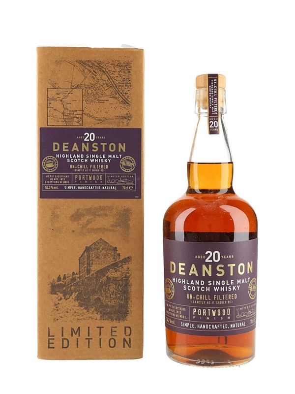 A bottle of Deanston 20 Year Old Single Malt Scotch Whisky finished in portwood casks and bottled at 54.2%.